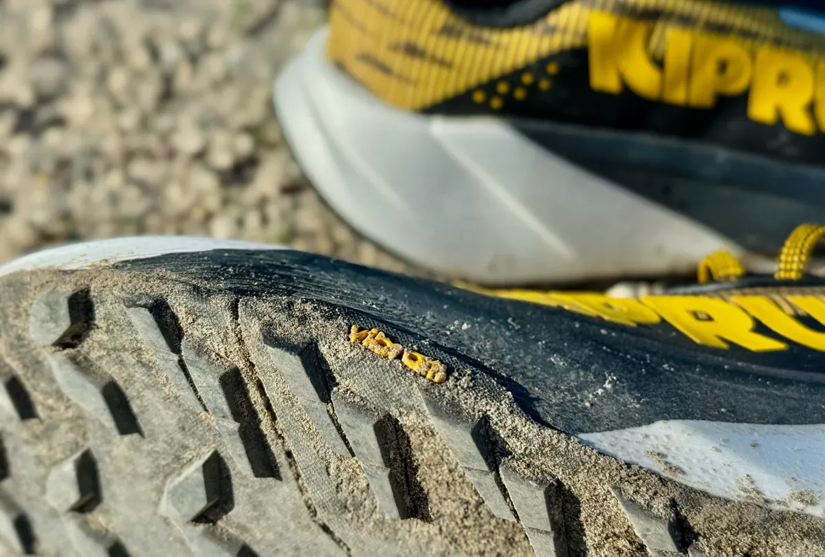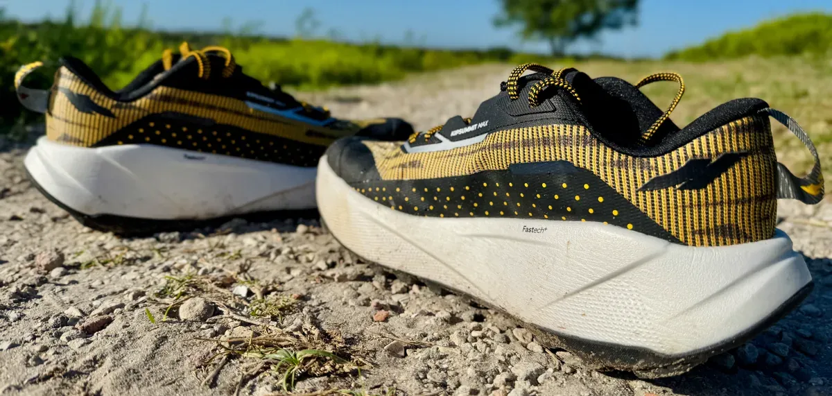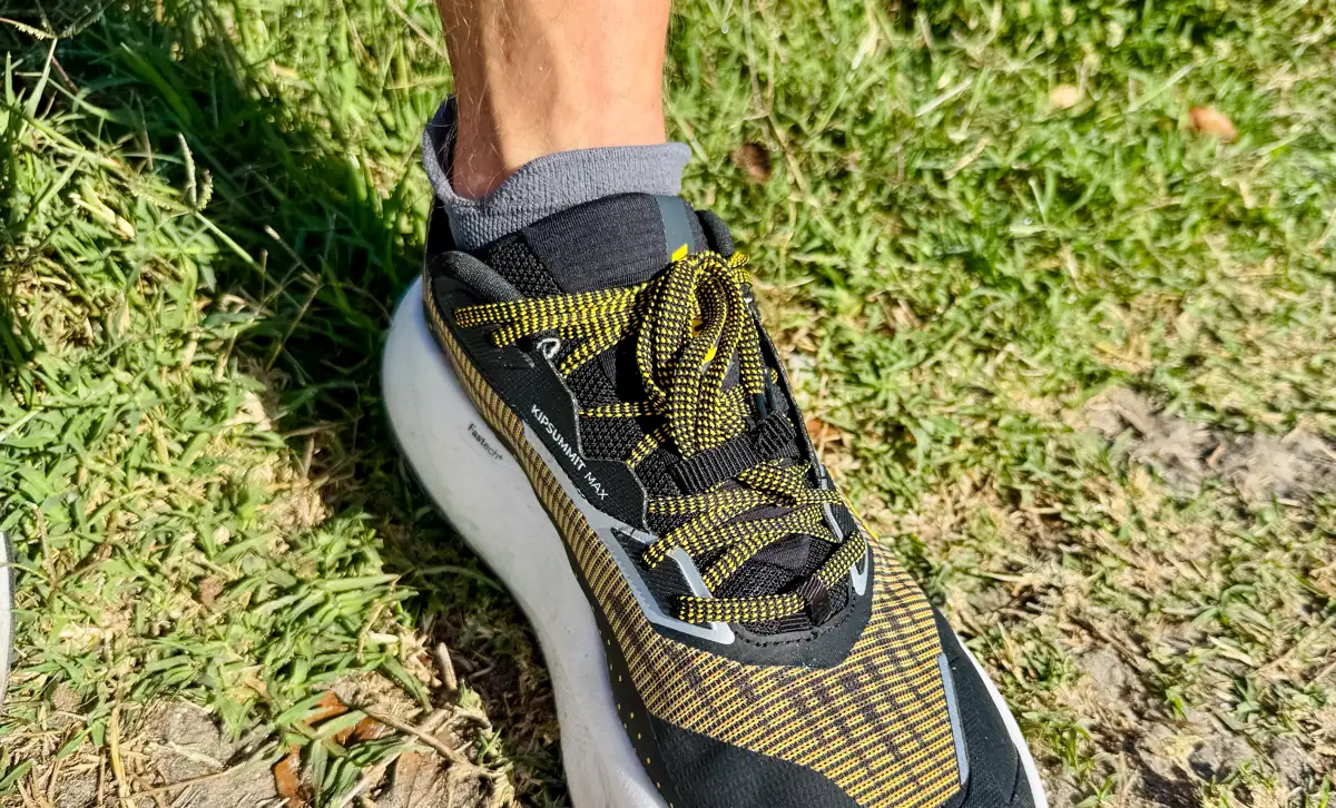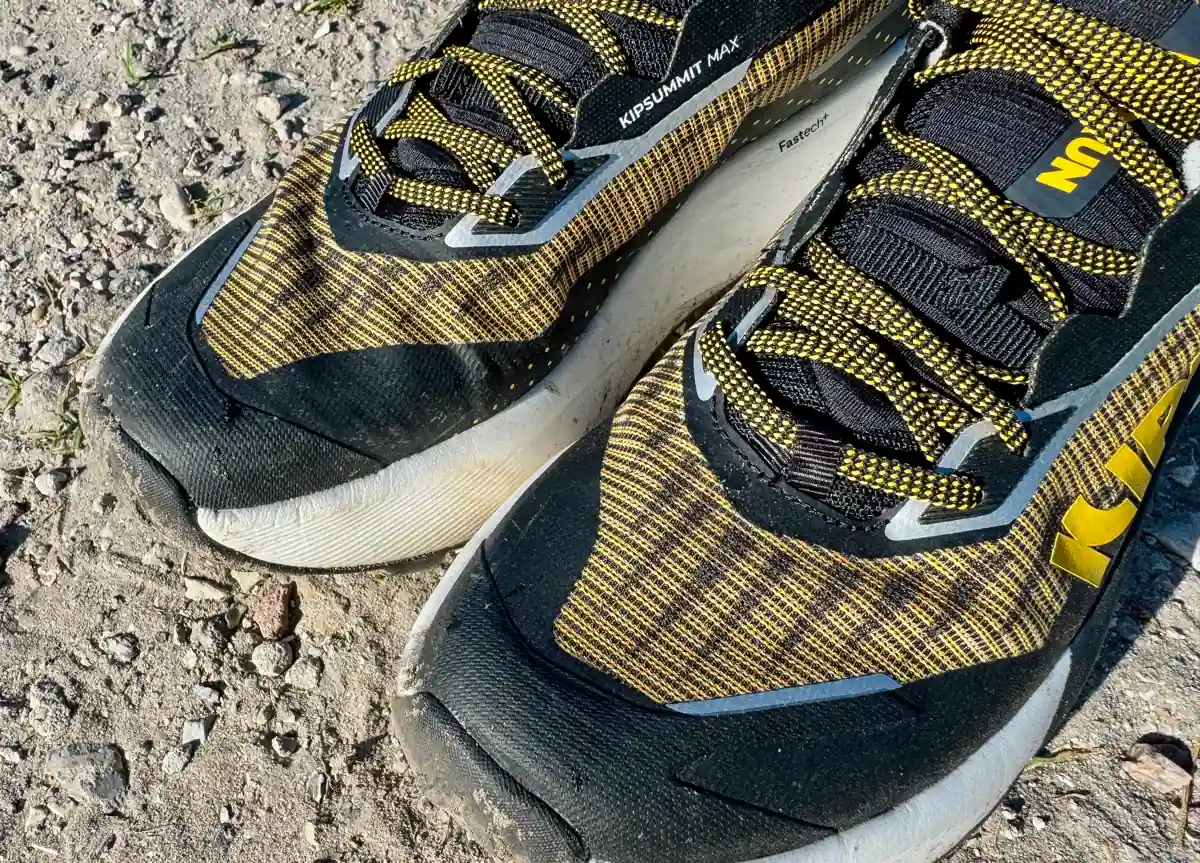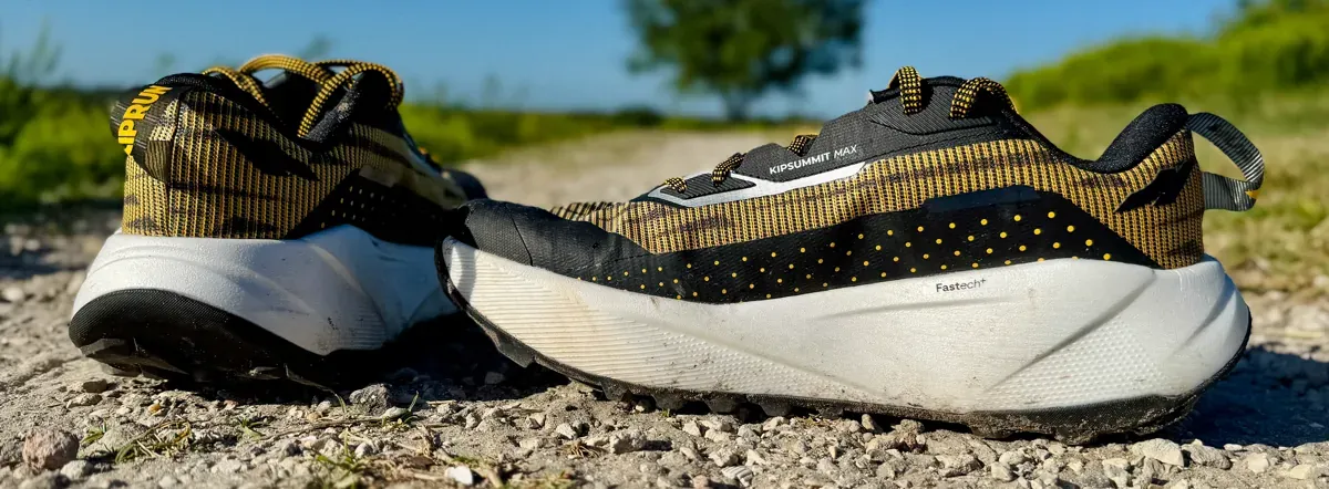 On light trails, the KipSummit Max holds up well. The wide platform, approximately 95 mm at the heel and 110 mm at the forefoot, and the bathtub-style sidewall foam give it a grounded, confident feel for a shoe sitting on nearly 39 mm of soft foam. It's stable enough that you won't be thinking about it on smoother singletrack or rolling terrain.
