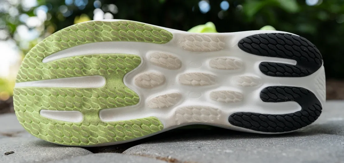 The exposed foam in the midfoot keeps the ride flexible and the overall package light, and early durability testing suggests the rubber holds up well across high-mileage use. It's not the most aggressive outsole pattern in the category, but for a road daily trainer logging easy and long-run miles, it's exactly what it needs to be.