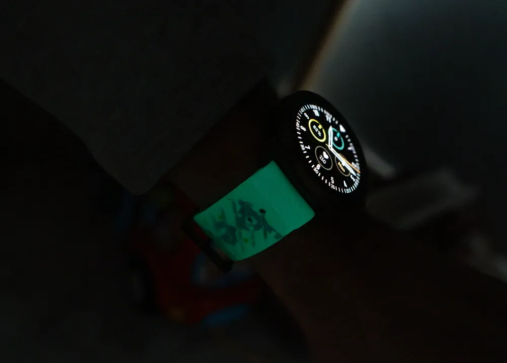 See the photo above demonstrating the glow of the watch strap, alongside the brightness of the AMOLED for reference.